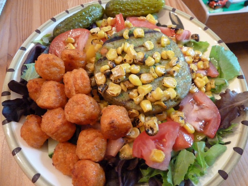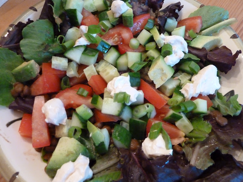 I had the dregs of some baby romaine in the fridge, as well as an unopened container of Tofutti sour cream that had been sitting there since approximately April :) Aha, I'll make a Mexican salad! I tossed everything - lentils, veggies, sour cream - over the lettuce. It was a little bit lacking in salt, so I ended up crumbling some tortilla chips on top and drizzling it with lots of Cholula Chipotle hot sauce. Much better!
