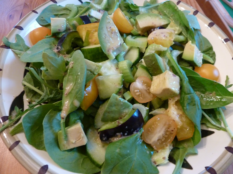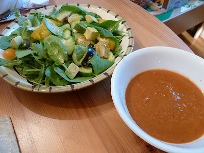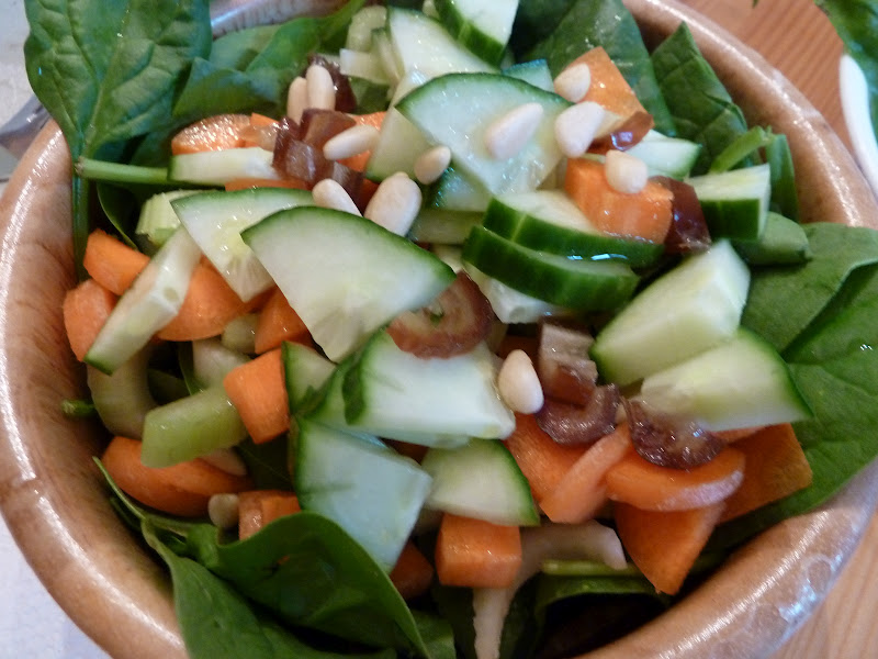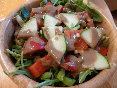 Baby romaine, chopped cucumber, celery, and tomato, drizzled with Jalapeno-Tahini Dressing from Ani's Raw Food Essentials. This dressing was kick-ass...fresh jalapeno, fresh garlic, tahini, lemon juice, and Braggs. The jalapeno was making my lips tingle!